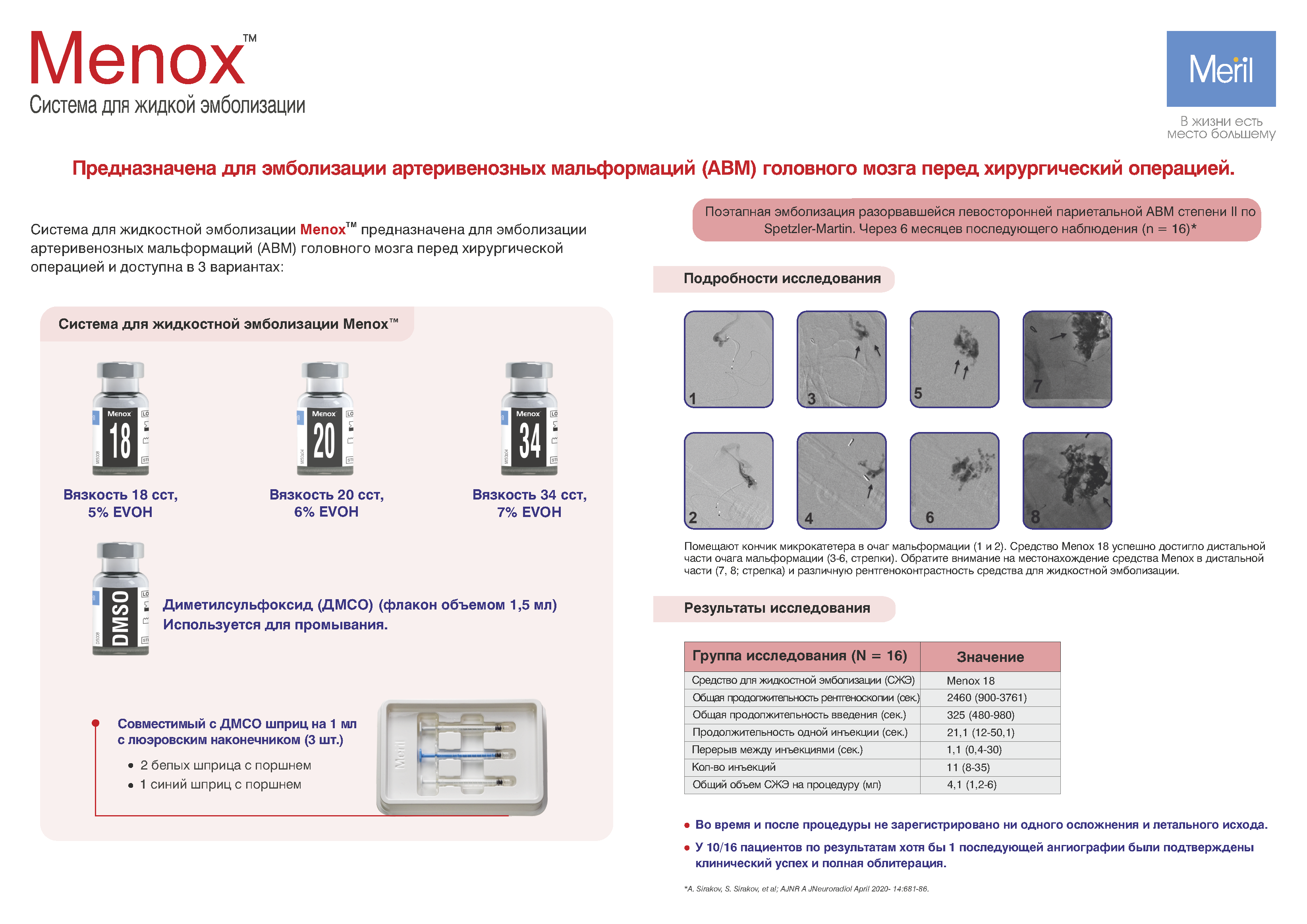 Menox™ — жидкий эмболизирующий агент, применяемый для лечения артерио-венозных мальформаций головного мозга (АВМ). Препарат предназначен для селективной эмболизации сосудистых патологий центральной нервной системы и используется при нейроэндоваскулярных вмешательствах.