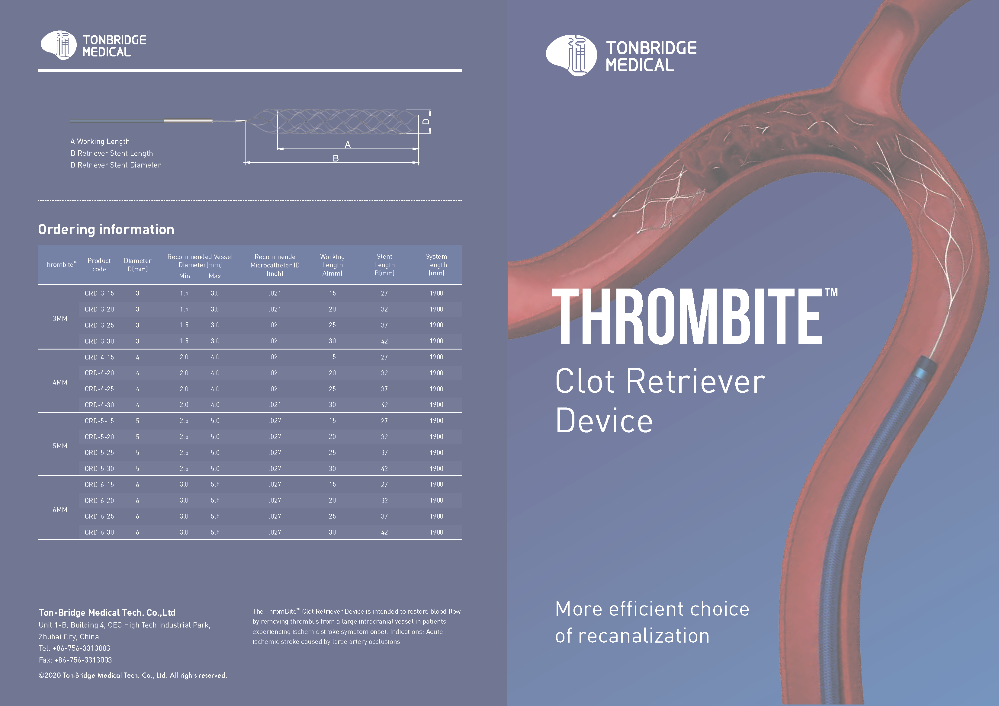 Thrombite™ Clot Retriever Device — это самораскрывающийся стен-ретривер, разработанный для восстановления кровотока при остром ишемическом инсульте путём удаления тромба из крупных внутричерепных сосудов. Его запатентованная S-образная спиральная открытая структура обеспечивает надёжное захватывание и удержание тромботических масс, а полностью радиопрозрачные маркеры гарантируют точное позиционирование. Устройства выпускаются диаметрами 3–5 мм и рабочей длиной 15–30 мм, сочетая высокую радиальную силу для эффективной интеграции с тромбом и низкое номинальное усилие для минимизации травмы стенки сосуда и риска дистальной эмболии.